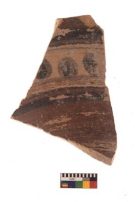 | Description / विवरण | Specimen of black on red ware with black decorative Horizontal bands with circles below geometric painting. |