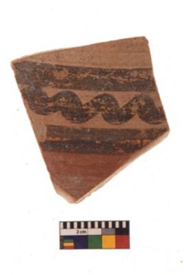 | Description / विवरण | Specimen of black on red ware with black decorative Horizontal lines with wavy line in between geometric painting. |