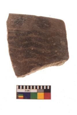 | Description / विवरण | Specimen of black on red ware with black decorative Row of circles with wavy lines below geometric painting. |