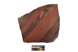 | Description / विवरण | Specimen of Potsherd black on red painted pottery. It is fine fabric in sharp contrast with painted design are executed in black pigment. |