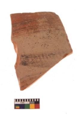 | Description / विवरण | Specimen of black on red ware with black decorative Leaf like motif with vertical strokes inside geometric painting. |