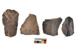 | Description / विवरण | There are n 4 utilized flakes. There are multi directional irregular scar pattern on both dorsal and ventral face of the flakes. One has blunted base and three are tapering at one end. |