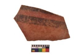 | Description / विवरण | Specimen of Potsherd black on red painted pottery. It is fine fabric in sharp contrast with painted design are executed in black pigment. |
