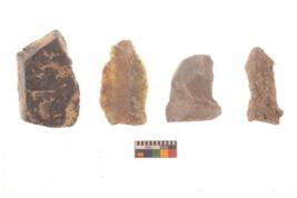 | Description / विवरण | There are n 4 flakes tool; there are flakes tool with prominent flaking marks. It made up of a large flakes with sides trimmed. |