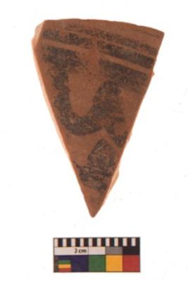 | Description / विवरण | Specimen of black on red ware with black decorative Horizontal lines with joined curves below geometric painting. |