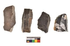 | Description / विवरण | There are n 4 utilized flakes. There are multi directional irregular scar pattern on both dorsal and ventral face of the flakes. Two are blunted base and two are sharp edges. |