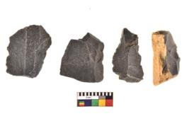| Description / विवरण | There are n 4 utilized flakes. There are multi directional irregular scar pattern on both dorsal and ventral face of the flakes. Two are tapering at one end and one is pointed and one is blunted edges. |
