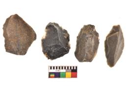 | Description / विवरण | There are n 4 utilized flakes. There are multi directional irregular scar pattern on both dorsal and ventral face of the flat two are blunted at one end and one is sharp and one is flat edges. |