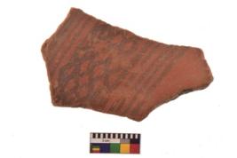| Description / विवरण | Specimen of potsherd with black decorative geometric Net Pattern painting . |