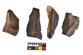 | Description / विवरण | There are n 4 utilized flakes. There are multi directional irregular scar pattern on both dorsal and ventral face of the flakes. Two are tapering at one end and two have sharp edges. |