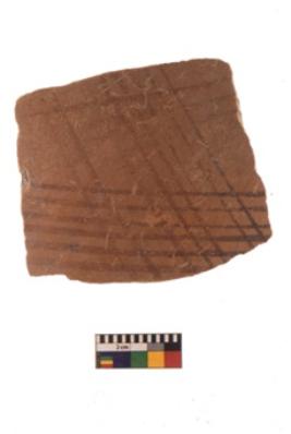 | Description / विवरण | Specimen of black on red ware with black decorative Mesh like design geometric painting. |
