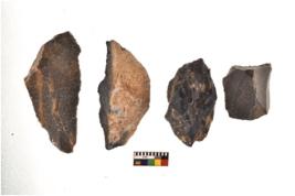 | Description / विवरण | There are n 4 utilized flakes. There are multi directional irregular scar pattern on both dorsal and ventral face of the flakes. Two are tapering at one end and two have blunted edges. |