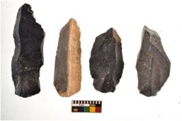 | Description / विवरण | There are n 4 utilized flakes. There are multi directional irregular scar pattern on both dorsal and ventral face of the flakes. Three are pointed at one end and one has blunted edge. |