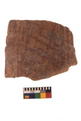 | Description / विवरण | Specimen of black on red ware with black decorative Lattice pattern geometric painting. |