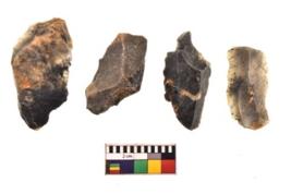 | Description / विवरण | There are n 4 utilized flakes. There are multi directional irregular scar pattern on both dorsal and ventral face of the flakes. One is pointed at one end three have blunted edges. |
