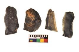 | Description / विवरण | There are n 4 utilized flakes. There are multi directional irregular scar pattern on both dorsal and ventral face of the flakes. Three are blunted at one end and one has sharp edge. |
