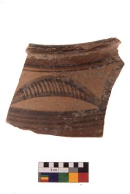 | Description / विवरण | Specimen of black on red ware with black decorative Horizontal bands with leaf like motif in between nature painting. |