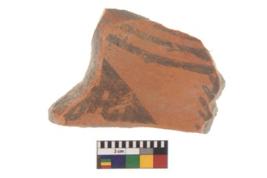| Description / विवरण | Specimen of Potsherd black on red painted pottery. It is fine fabric in sharp contrast with painted design are executed in black pigment. |