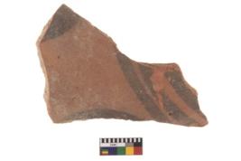 | Description / विवरण | Specimen of Potsherd black on red painted pottery. It is fine fabric in sharp contrast with painted design are executed in black pigment. |