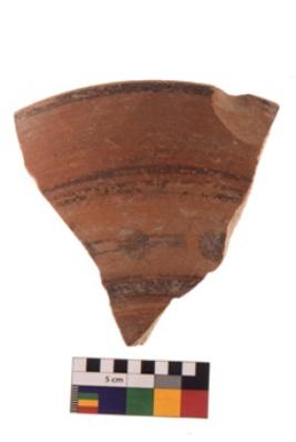 | Description / विवरण | Specimen of black on red ware with black decorative Horizontal bands with circles in between geometric painting. |