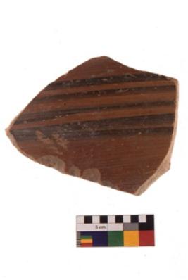 | Description / विवरण | Specimen of black on red ware with black decorative Horizontal lines geometric painting. |