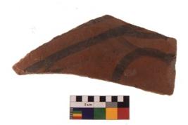 | Description / विवरण | Specimen of black on red ware with black decorative Horizontal line with a semi circle below geometric painting. |