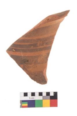 | Description / विवरण | Specimen of Potsherd black on red painted pottery. It is fine fabric in sharp contrast with painted design are executed in black pigment. |