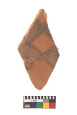 | Description / विवरण | Specimen of Potsherd with black decorative geometric diamond set broad horizontal bands painting . |