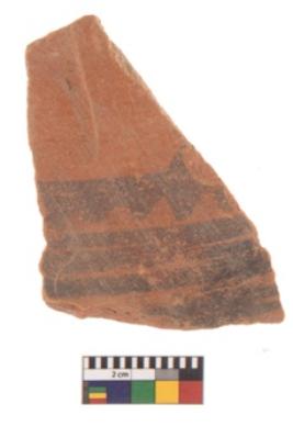 | Description / विवरण | Specimen of Potsherd black on red painted pottery. It is fine fabric in sharp contrast with painted design are executed in black pigment. |