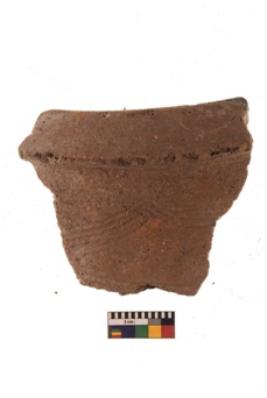 | Description / विवरण | Specimen of red ware with decorative Joined curves incisions. |