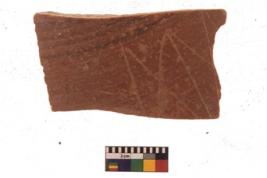 | Description / विवरण | Specimen of black on red ware with black decorative Horizontal lines with graffiti below geometric painting. |
