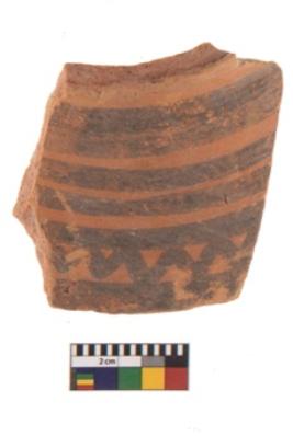 | Description / विवरण | Specimen of Potsherd black on red painted pottery. It is fine fabric in sharp contrast with painted design are executed in black pigment. |