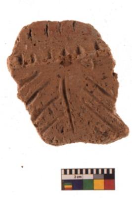 | Description / विवरण | Specimen of red ware with decorative Leaf like design incisions. |