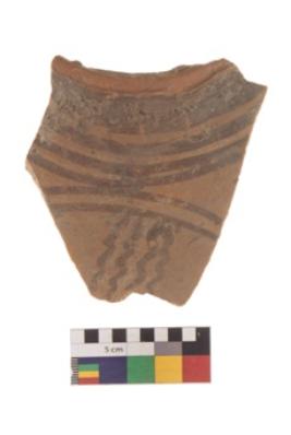 | Description / विवरण | Specimen of Potsherd black on red painted pottery. It is fine fabric in sharp contrast with painted design are executed in black pigment. |