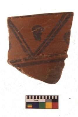 | Description / विवरण | Specimen of black on red ware with black decorative V shape lines with circles in between geometric painting. |