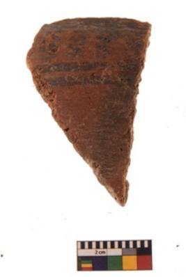 | Description / विवरण | Specimen of black on red ware with black decorative Horizontal lines with circles in between geometric painting. |