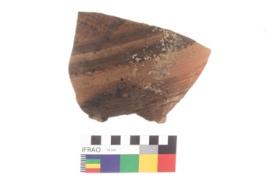| Description / विवरण | Specimen of Potsherd with black decorative geometric diamond set broad horizontal bands painting . |