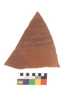 | Description / विवरण | Specimen of Potsherd with black decorative geometric diamond set broad horizontal bands painting . |