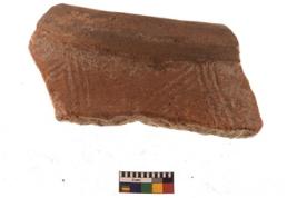 | Description / विवरण | Specimen of red ware with decorative V shape design incisions. |