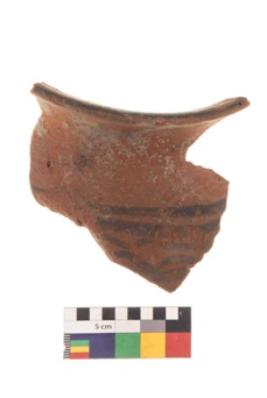 | Description / विवरण | Specimen of Potsherd black on red painted pottery. It is fine fabric in sharp contrast with painted design are executed in black pigment. |