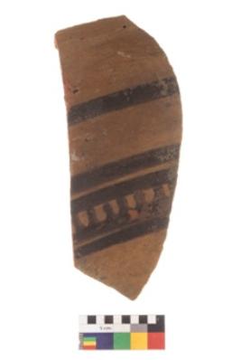 | Description / विवरण | Specimen of Potsherd black on red painted pottery. It is fine fabric in sharp contrast with painted design are executed in black pigment. |