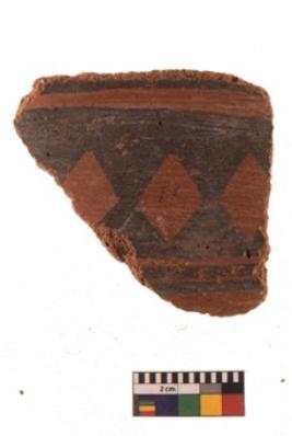 | Description / विवरण | Specimen of black on red ware with black decorative Joined diamond shaped design geometric painting. |