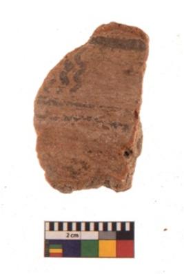 | Description / विवरण | Specimen of black on red ware with black decorative Wavy lines between horizontal lines geometric painting. |