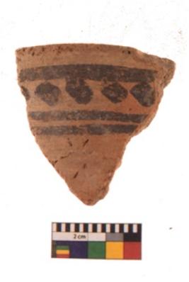 | Description / विवरण | Specimen of black on red ware with black decorative Horizontal lines with a row of diamond shaped design geometric painting. |