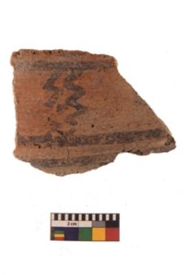 | Description / विवरण | Specimen of black on red ware with black decorative Horizontal lines with wavy lines in between geometric painting. |