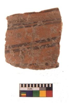 | Description / विवरण | Specimen of black on red ware with black decorative Horizontal lines geometric painting. |
