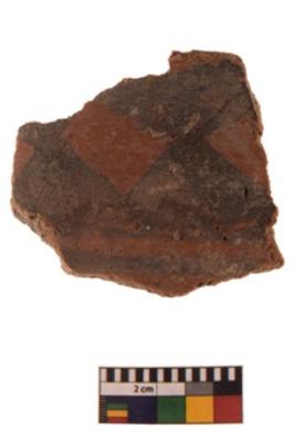 | Description / विवरण | Specimen of black on red ware with black decorative Joined diamond shaped design geometric painting. |
