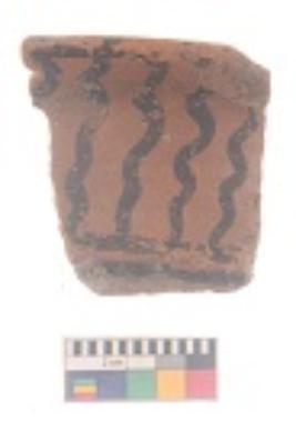 | Description / विवरण | Specimen of black on red ware with black decorative Wavy bands in between horizontal lines geometric painting. |