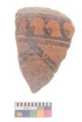 | Description / विवरण | Specimen of black on red ware with black decorative Horizontal lines and a suspended loop with a circle on the right geometric painting. |