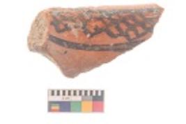 | Description / विवरण | Specimen of black on red ware with black decorative Diamond lattice design in between horizontal lines geometric painting. |
